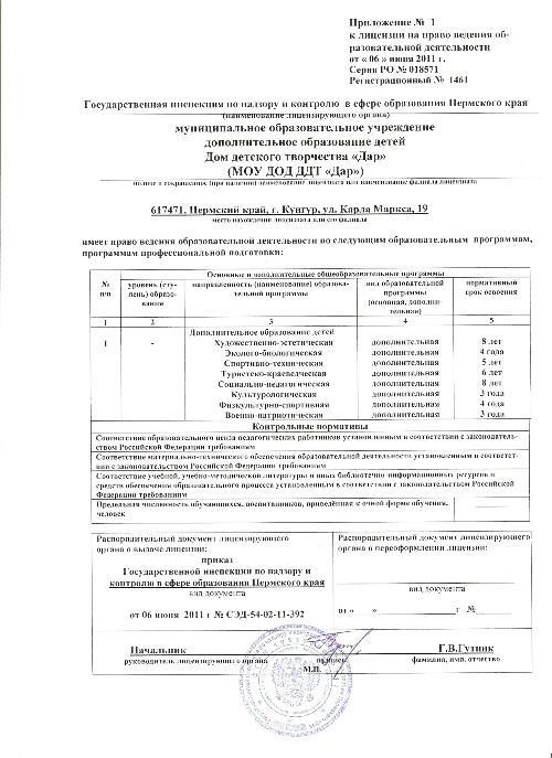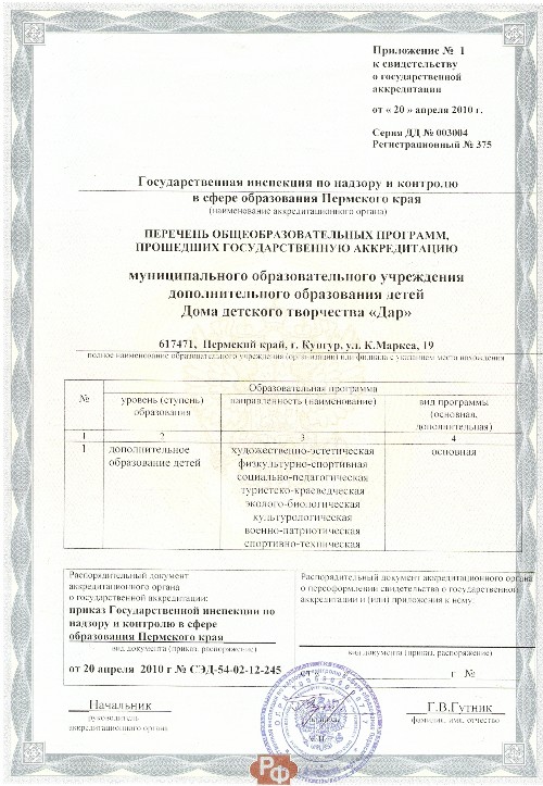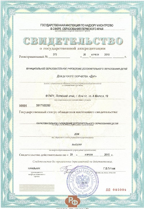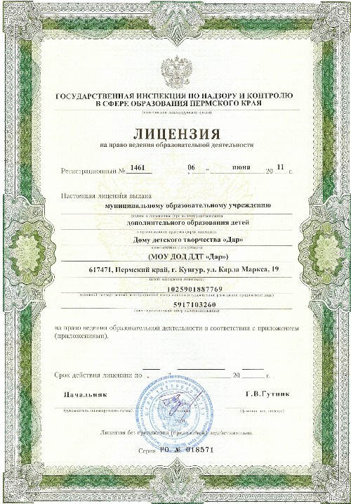 Дом детского творчества «Дар» в соответствии с Уставом реализует образовательные программы дополнительного образования детей по направленностям: художественно-эстетическая, эколого-биологическая, спортивно-техническая, туристско-краеведческая, социально-педагогическая, культурологическая, физкультурно-спортивная, военно-патриотическая. Образовательные программы реализуются на основании Лицензии Государственной инспекции по надзору и контролю в сфере образования Пермского края на право ведения образовательной деятельности (от 06 июня 2011 года, серия РО № 018571, регистрационный № 1461), Свидетельства Государственной инспекции по надзору и контролю в сфере образования Пермского края о государственной аккредитации (от 20 апреля 2010 года, серия ДД № 003004, регистрационный № 375).